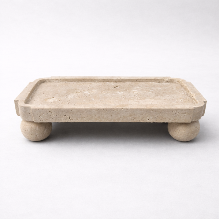 The Luna Vanity Riser Tray is handcrafted from natural travertine stone and designed to elevate everyday essentials with understated luxury. Resting on sculpted spherical feet, this low-profile riser adds height, balance, and architectural character to bathroom vanities, consoles, and countertops.