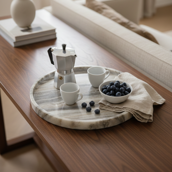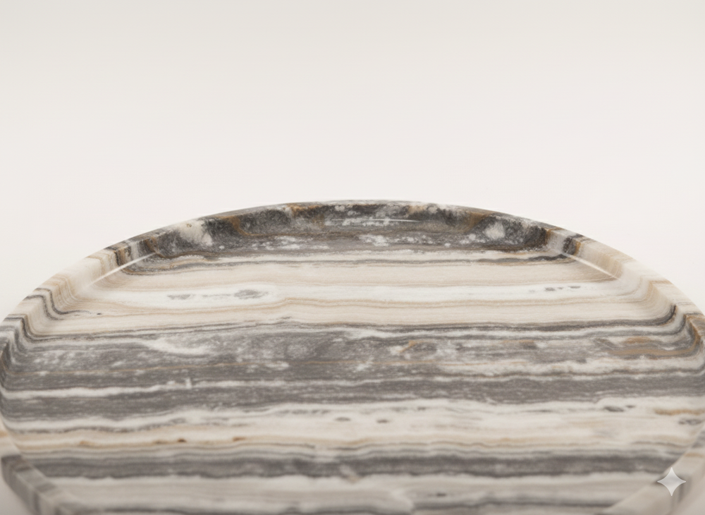 The Oryn Plate (12" Diameter) is handcrafted from natural stone, combining the luxurious depth of Onyx with the warm, textured elegance of Travertine. Each piece features organic, unrepeatable veining and surface detail, making every plate a unique work of art. Finished with a smooth, high-gloss polish, it elevates both presentation and decor. Perfect for serving, styling fragrances, displaying jewelry, or enhancing vanity and console spaces. Designed for refined interiors and premium everyday experiences.
